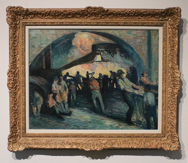 My favorite piece from the Gorun donation is this painting of foundry workers by Maximilien Luce, in part because I had the pleasure of researching it for the catalog record. I liked learning about Luce–a French painter who lived 1858-1941 and was associated with the Anarchist movement. This painting and many of his other works show his interest in the experiences of working people and how the industrial revolution was impacting the world around him.