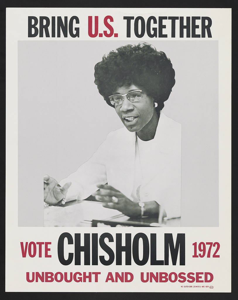 The poster’s design reinforces that call for a new direction in the monotonous establishment. The phrase “BRING U.S. TOGETHER” uses color to highlight the U.S., causing viewers to read it as both “us” and “United States.” This double meaning reflects her appeal to national unity at a time of social upheaval. Tammy Brown explains that Chisholm’s appeal relied on her unique ability to “reconcile seemingly contradictory philosophies of racial, ethnic, and feminist pride with humanist and universalist ideals.”¹ This poster reflects that balance as Chisholm stands proudly as a Black woman candidate, inviting all Americans into a shared political vision.