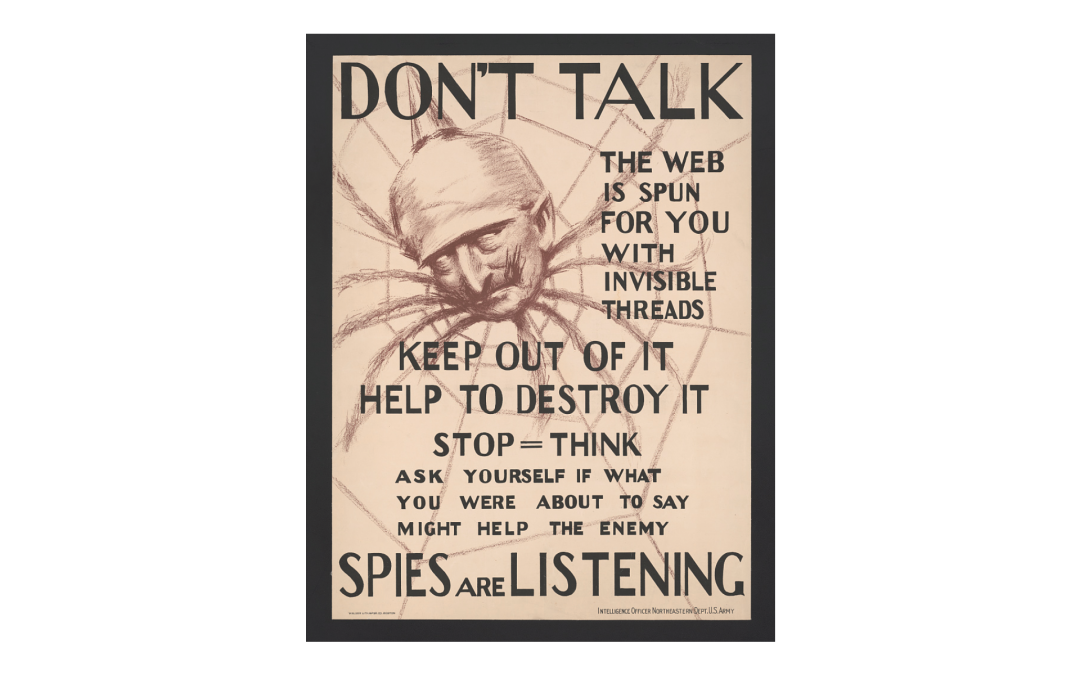 - Walker Lithograph & Publishing Co. Don’t Talk, the Web Is Spun for You with Invisible Threads, Keep Out of It, Help to Destroy It—Spies Are Listening. Boston, 1918. Library of Congress Prints and Photographs Division, https://www.loc.gov/resource/ppmsca.53575/