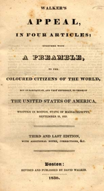 1 “David Walker, 1785-1830. Walker’s Appeal, in Four Articles; Together With a Preamble, to the Coloured Citizens of the World, but in Particular, and Very Expressly, to Those of the United States of America, Written