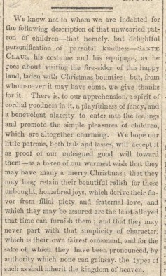 This piece was unique as it offered a different take on Santa Claus, a figure who was, until up until this point, traditionally depicted as a thinner, a less jolly, horse-riding disciplinarian. He was a combination of stories about the British Father Christmas, the Dutch Sinterklaas, and the fourth-century bishop Saint Nicholas of Myra.