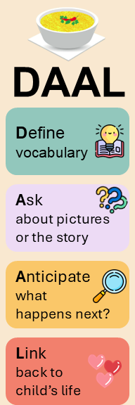 We developed a culturally responsive shared book reading intervention for South Asian parents whose preschool-aged children have late language emergence — the South Asian shared Reading Intervention (SARI) protocol. Rather than follow the traditional dialogic reading sequence, we taught parents the PRE sequence: prompt, repeat, expand. We also modified the prompts from CROWD to the more parent-friendly and culturally relevant acronym: DAAL. Please feel free to print these and use with your children or share with clients!