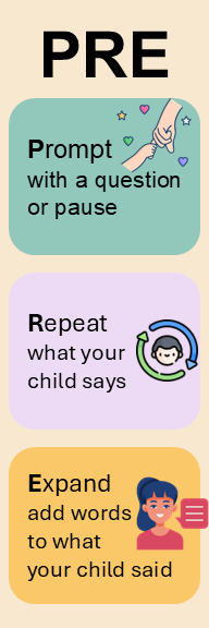 We developed a culturally responsive shared book reading intervention for South Asian parents whose preschool-aged children have late language emergence — the South Asian shared Reading Intervention (SARI) protocol. Rather than follow the traditional dialogic reading sequence, we taught parents the PRE sequence: prompt, repeat, expand. We also modified the prompts from CROWD to the more parent-friendly and culturally relevant acronym: DAAL. Please feel free to print these and use with your children or share with clients!