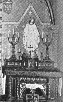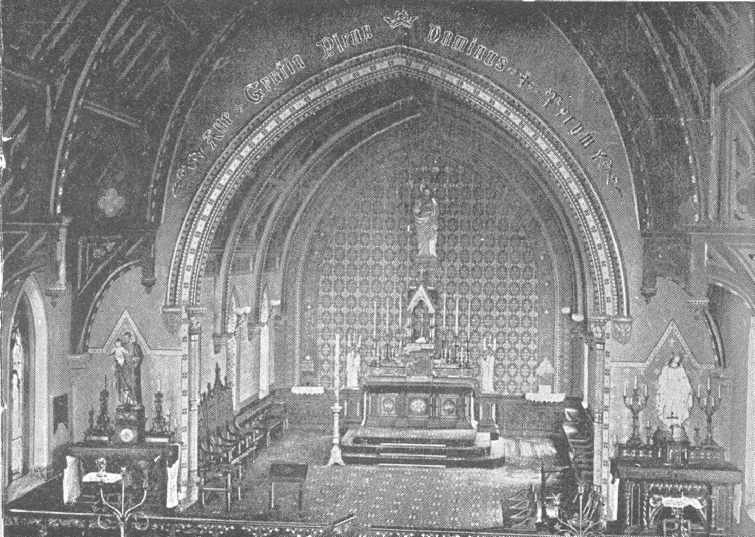 The Chapel has a traditional nineteenth century arrangement. A main altar on a three-step platform, or predella, with a central tabernacle flanked by gradines upon which are candlesticks. Flanking the main altar are two pedestals with angels holding additional candles. On the right and left, in from of the chancel arch, are side altars with polychrome, probably plaster, statues of the Blessed Virgin and St. Joseph. The photograph was probably taken during the Easter Season since the Paschal Candle is clearly visible to the left of the main altar. The dedication of the Chapel to Mary is indicated by the words “Ave, Gratia Plena, Dominus Tecum,” (Hail, Full of Grace, the Lord is with You) above the chancel arch. Stenciling is evident on the chancel arch, the nave arches, behind the main altar and behind the side altars. The altars are of finely carved wood, and each has a different design. The candlesticks on the altars are different as well. Lighting is provided by gas lamps in the sanctuary and in the nave. The nave lamps rise from the floor in the center of the pews. The chancel wall is painted and decorated with stenciling. There appears to be an inscription running along the line of the arch, but it is impossible to decipher it. The base of the chancel wall has an elaborately carved wainscoting. The floor is either tiled or covered with a patterned carpet. The one window visible, at the far left of the photograph, has a central figure surrounded by light glass, probably grisaille.