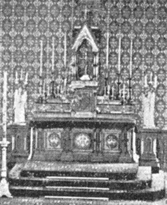 This photograph gives us the first view of the interior of the Chapel. Since only thirty years have passed since its construction, we may assume that the interior as we see it here is much the same as when Lamb decorated it and provided the fixtures.