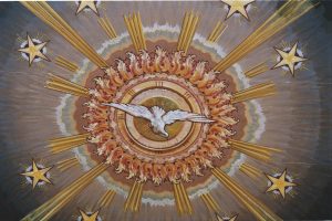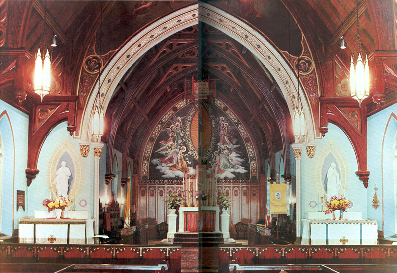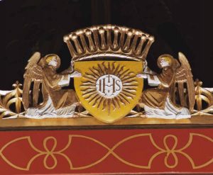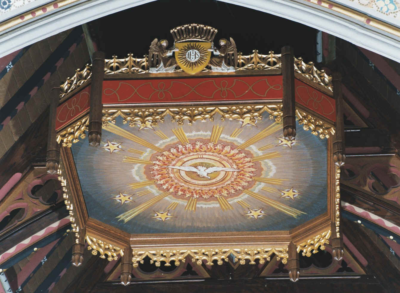 Unfortunately the baldachin is placed so high that it is hidden by the chancel arch. This is probably unavoidable since to place it lower would obscure the chancel wall mural of the Immaculate Conception. The red-bordered baldachin, embellished with gilt gothic tracery, features a painting of the Holy Spirit as a dove hovering over the altar. Flames radiate from the dove, exploding into clouds and rays of light on a star-studded blue sky. On the front of the baldachin, angels kneel in worship before a shield symbolizing the Eucharistic Host signed with the Greek letters “IHS,” the first three letters of “Jesus” in Greek. The shield is surmounted by a crown.