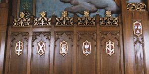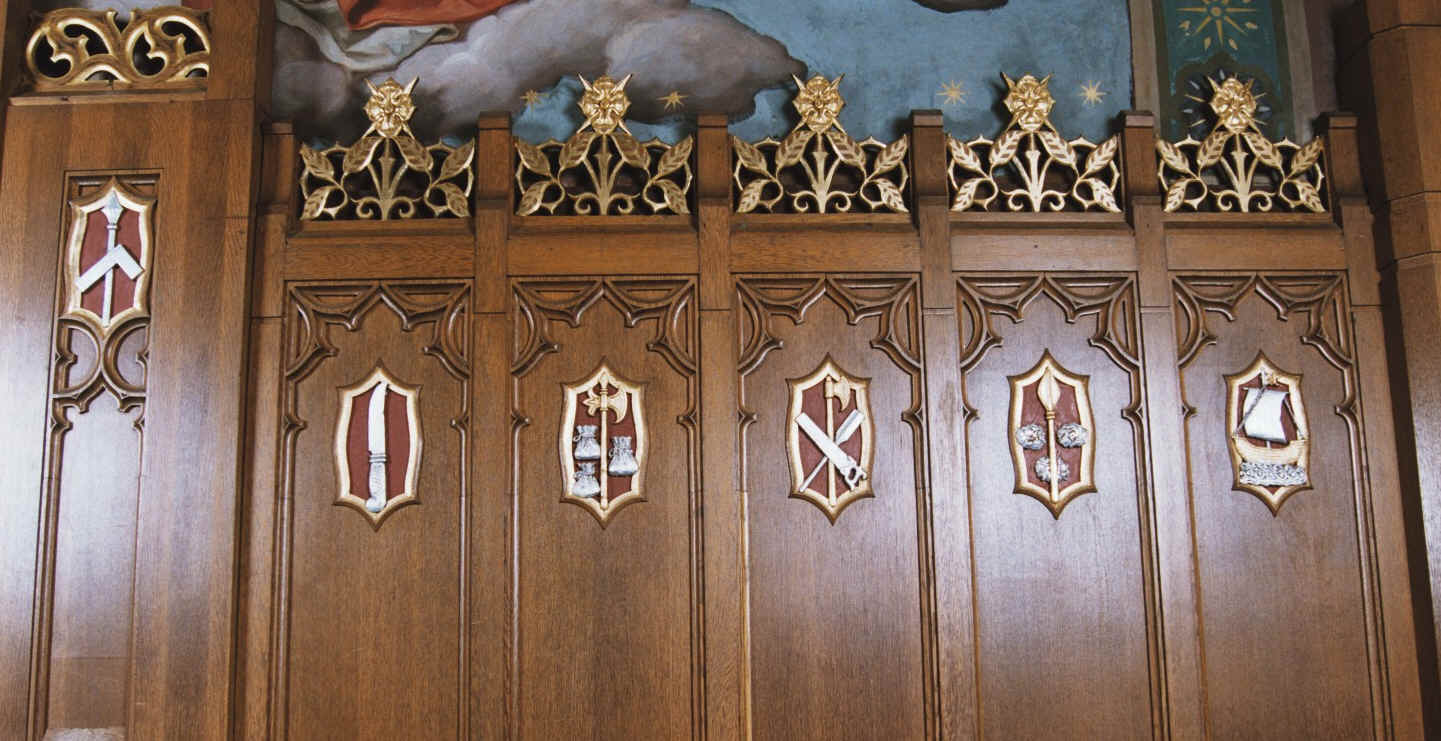 The chancel wall oak paneling is a contemporary version of gothic with elements of Art Deco. This style is common in churches of the second quarter of the twentieth century. On each panel is a shield with a symbol of one of the twelve Apostles. There is a variety of symbols associated with each of the individual Apostles. The order of precedence of the Apostles also varies. In all cases, St. Peter is given first place.