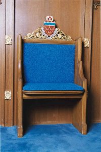 Similarly, a shrine for the Blessed Virgin replaced the altar of St. Joseph. The statue, from the 1931 renovation, was placed on a like pedestal and backed with portions of the 1963 reredos. A Marian symbol (a stylized letter “M”) was placed on the pedestal. The statue of St. Joseph was moved to a wood pedestal near the main entrance of the Chapel.
