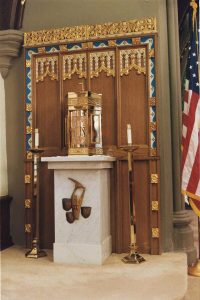 A shrine for the Eucharist replaced the altar of the Blessed Virgin. The 1947 tabernacle was placed on a platform created from portions of the dismantled 1931 “Msgr. Meehan” side altars. The “consecration crosses” (carved crosses on the top portion of an altar anointed with oil when the altar is consecrated) can be seen on the front of this platform. The platform was embellished with an ewer and loaves motif, recalling the bread and wine of the Eucharist. The left and right sections of the 1963 reredos (the central canopy portion was discarded) were placed behind and flanking the tabernacle. Additional oak paneling was added below the reredos.