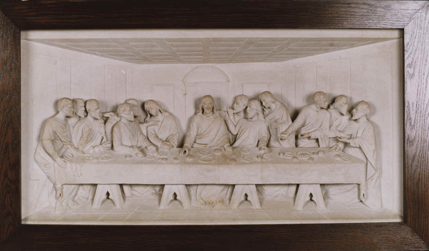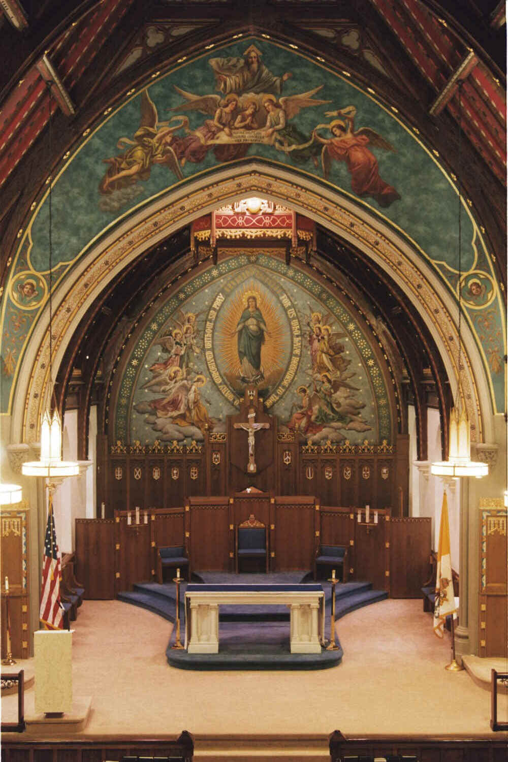 The main and side altars were dismantled. Portions of the “Msgr. Whelan” marble main altar from 1915 were used to create a permanent free-standing altar on the first level of a rounded platform in the center of the sanctuary. At the rear of this platform, two steps up, a new chair for the celebrant was placed. This chair bears the university arms. Immediately behind the platform a wood screen was placed transforming the rear area of the chancel into a storage area for liturgical vessels and implements. The marble crucifix from the 1947 renovation was placed on the rear wall of the chancel below the mural of the Immaculate Conception. The marble carving of the Last Supper was placed on the right side wall of the Chapel.