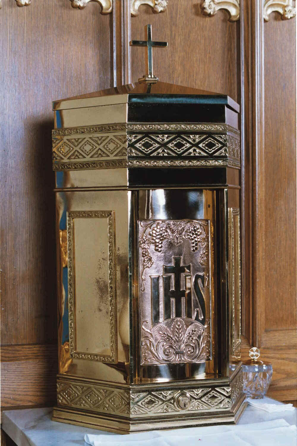 A shrine for the Eucharist replaced the altar of the Blessed Virgin. The 1947 tabernacle was placed on a platform created from portions of the dismantled 1931 “Msgr. Meehan” side altars. The “consecration crosses” (carved crosses on the top portion of an altar anointed with oil when the altar is consecrated) can be seen on the front of this platform. The platform was embellished with an ewer and loaves motif, recalling the bread and wine of the Eucharist. The left and right sections of the 1963 reredos (the central canopy portion was discarded) were placed behind and flanking the tabernacle. Additional oak paneling was added below the reredos.