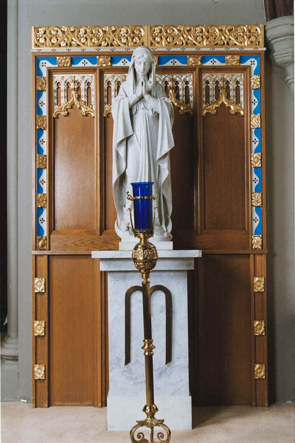 Similarly, a shrine for the Blessed Virgin replaced the altar of St. Joseph. The statue, from the 1931 renovation, was placed on a like pedestal and backed with portions of the 1963 reredos. A Marian symbol (a stylized letter “M”) was placed on the pedestal. The statue of St. Joseph was moved to a wood pedestal near the main entrance of the Chapel.