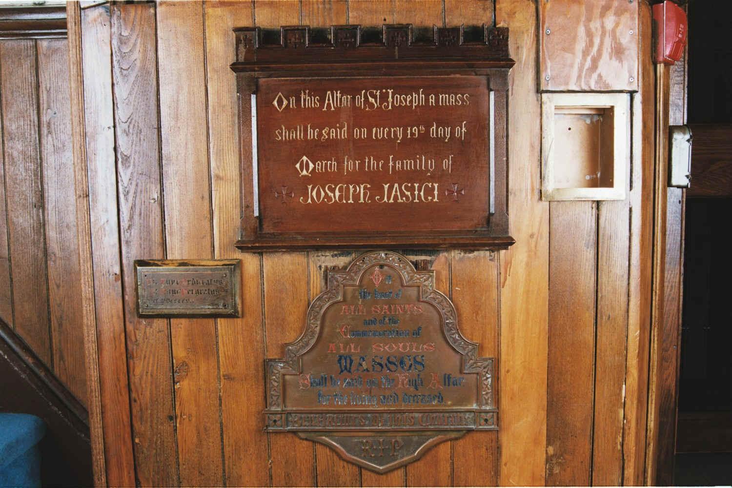 The baldachin was moved forward to place it over the new altar. The central sections of the nineteenth century altar rail were removed. The plaque commemorating the benefactors of the Chapel, the Jasici plaque from the altar of St. Joseph, and the small plaque were placed on the rear wall of the Chapel, to the right of the main entrance. Private Mass altars in the choir or organ loft, which may have been the original wood side altars, were removed. Air conditioning was installed and the lighting enhanced.