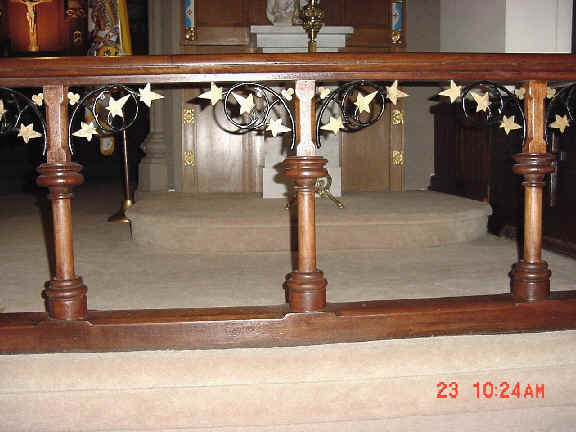 Another fixture of the early Chapel remains, in part. The altar rail, composed of a wood hand rest set on wood pillars, and decorated with wrought iron leaves and vines, is still in place. Originally the altar rail had hooks on the chancel side that held a linen cloth that was placed over the hand rest during Communion.
