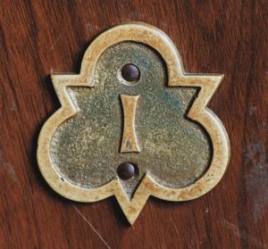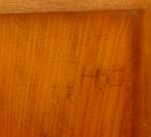 The front hand rest remains as well. A careful examination will reveal the remains of carved initials, a reminder of students of the past. When the seats of the pews were replaced, the carvings unfortunately were sanded into obscurity.