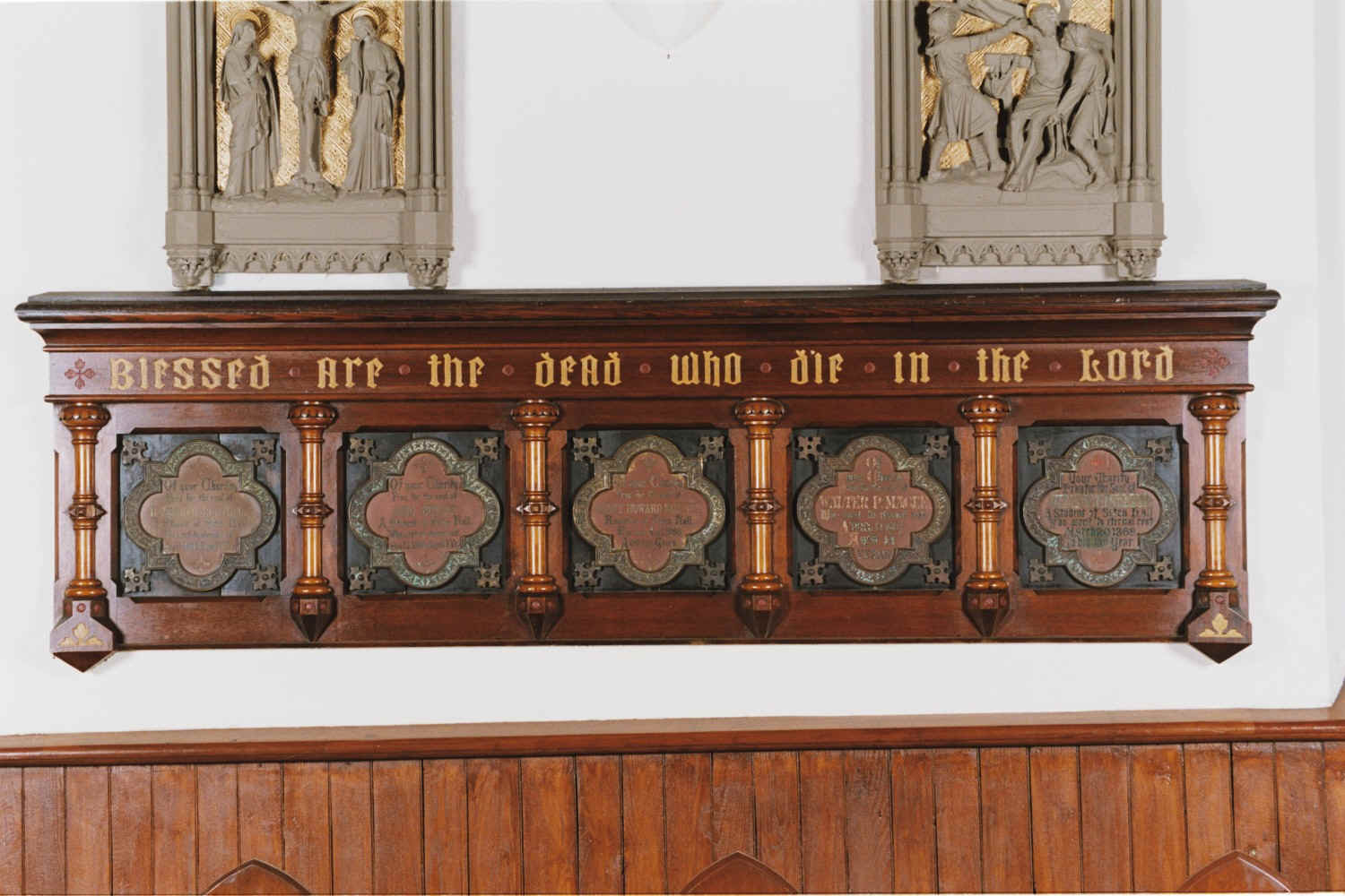 This unusual funerary monument, in the form of a coffin, is on the right wall of the nave. It contains five memorial plaques, four for students who died in the 1860s and one for the college registrar.