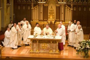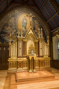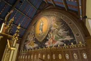Central to the mural on the sanctuary wall is the depiction of the Immaculate Conception by Ferdinand Beraldi in 1906 and transformed by Gonippo Raggi in 1931. Below the mural is the restored 1947 oak paneling embellished with shields of the symbols of the Twelve Apostles. Part of the paneling is hidden by the Shrine of the Blessed Sacrament. Three shields have been added in the 2008 restoration: shields of Seton Hall University, the Bayley family, and the Seton family.