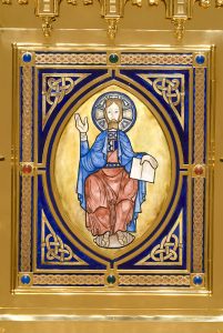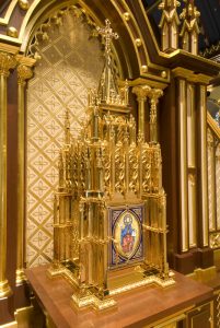 The Shrine of the Blessed Sacrament, fabricated of carved mahogany in the Gothic style with gold leaf accents provides an appropriate setting for a magnificent gilt Gothic tabernacle. The tabernacle is reminiscent of the spire of a Gothic church. The tabernacle door is enriched with an enameled panel depicting Christ in majesty.