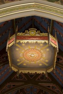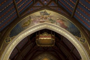 We see echoes of the 1863 decoration in the details of the corbels “supporting” the sanctuary arch. It is a rich sculpture of oak leaves and acorns, perhaps reminiscent of the oak trees that still grace the campus. New gold leaf makes them stand out once again. The great arch of the sanctuary itself has been embellished with gold leaf and stenciling.