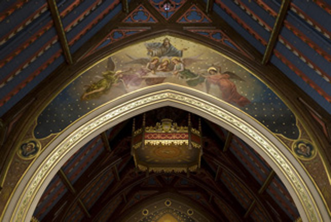 As we enter the chapel, we see new oak wainscoting throughout. Above the wainscoting is stenciling with a leaf, rose, cross, and fleur-de-lis motif. The stenciling also forms a frame for the restored stained-glass windows of 1908. Along the walls, the fourteen Stations of the Cross, designed by Raffl of Paris in 1931, have been restored to their original form and color. Raising our eyes to the ceiling, we see a sky-blue ceiling with silver stars. Many churches through the centuries, particularly the medieval period, used this motif to remind worshippers that their ultimate journey is to join the Lord in heaven.