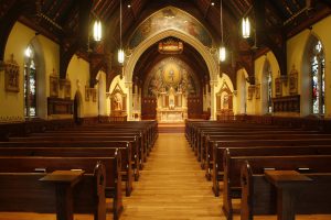 On either side of the sanctuary are the Shrines of Our Lady and St. Joseph. The statue of Mary is polychrome carved wood in the Gothic style. It depicts Mary offering Jesus, her son, to the world. The statue of St. Joseph, in the same style, depicts St. Joseph showing a scroll to the Child Jesus. On the scroll, in Hebrew, are words taken from Psalm 40, verses 8 and 9: “Then I said, ‘Behold, I come. In the roll of the book it is written of me: I delight to do your will, my God, and your law is in my heart.'”