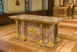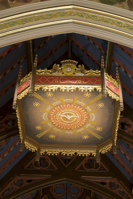 Above the altar is the restored 1947 baldachin depicting the Holy Spirit in the form of a dove. The front of the baldachin shows angels wearing dalmatics on either side of a shield containing a host ensigned with the letters “IHS,” the first three Greek letters of the Holy Name of Jesus. Above the letters we can see a small cross and below three nails recalling the crucifixion.