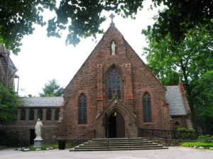 Sandstone from the neighboring Essex County quarries was unavailable; the stone either exhausted or the quarries closed and covered with urban and suburban expansion. As an example, the stone for Presidents Hall was quarried in downtown Newark, within a few hundred yards of where Sacred Heart Cathedral Basilica now stands. The stone for nearby St. John’s Church in Orange came from quarries in Llewellyn Park. Neither the residents of Newark nor those of Llewellyn Park would appreciate reopening the quarries.