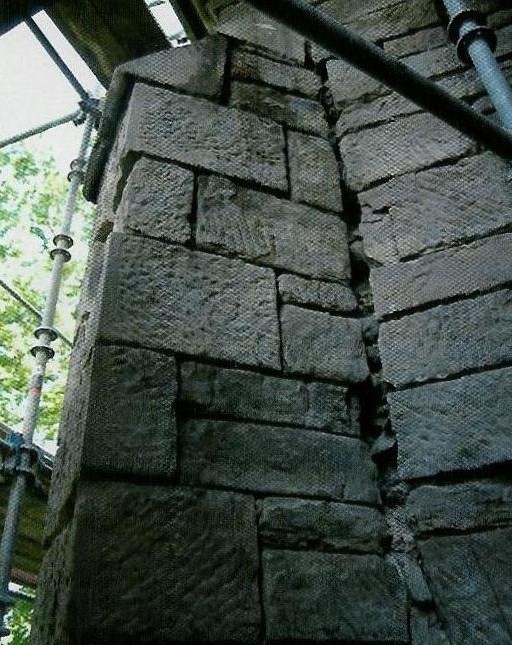 The false buttresses were removed and replaced with true buttresses that would insure the stability of the reinforced arch. The new buttresses were constructed of steel-reinforced concrete and then capped with sandstone, thus maintaining the original appearance while providing actual support.