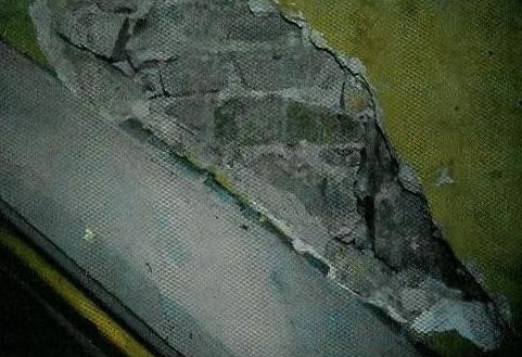 The cracks in the arch can be seen after the removal of the mural and the plaster.