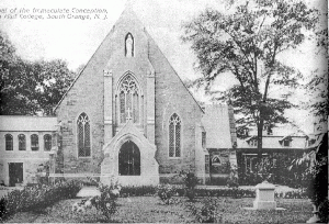 Since 1863, several additions and alterations have been made to the chapel. By 1887, a sacristy had been added to the sanctuary. In 1906, to celebrate the golden jubilee of Seton Hall College, major renovations took place. An arched passageway linking the chapel to the Seminary (Presidents Hall) was constructed, the belfry was removed and a new entrance cut beneath it, the old entry on the side facing Bayley Hall was closed and replaced with a chapel dedicated to the Sacred Heart. These changes were dictated by necessity. A sacristy was essential for the efficient use of the Chapel, as was a passageway to the Seminary. The bell tower had weakened, requiring its removal. The new entry enhanced the Chapel’s focus on the growing campus.