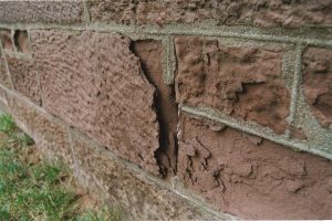 As the spalling became noticeable, some of the stones were repaired with a coating of mortar. While this may have improved the appearance, it also trapped moisture that increased the deterioration of the stone. Similarly, as the mortar between the stones loosened and fell out, it was replaced with a type of mortar that also trapped moisture.