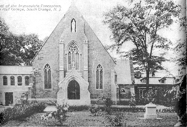 The picture of the Chapel in the colorized postcard above is taken from the same photograph as the black and white one above. It contains the only known photograph (upper center) of the “Bishop’s House,” the residence of the Bishops of Newark on the Seton Hall campus until 1957. Today the only remnant of the Bishop’s House is the “Carriage House,” now called the “Art Center,” which houses the Department of Art and Music.
