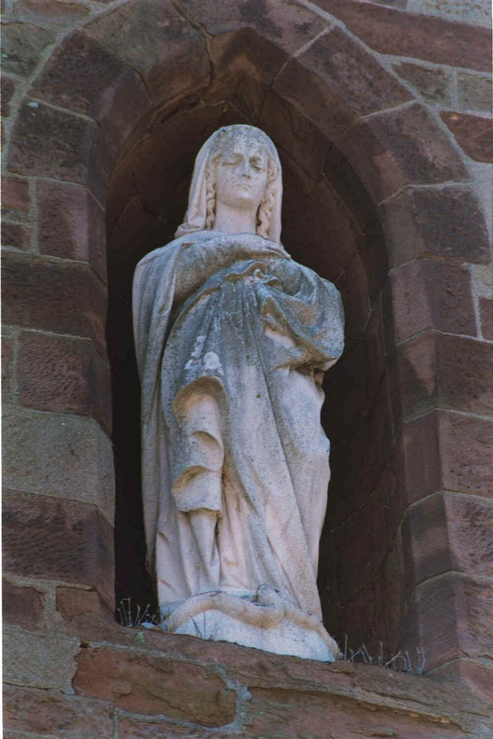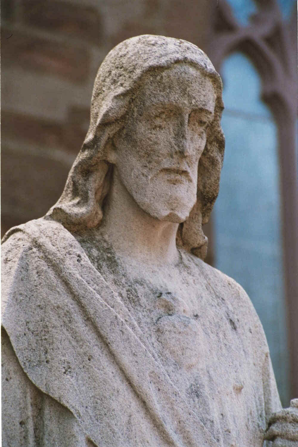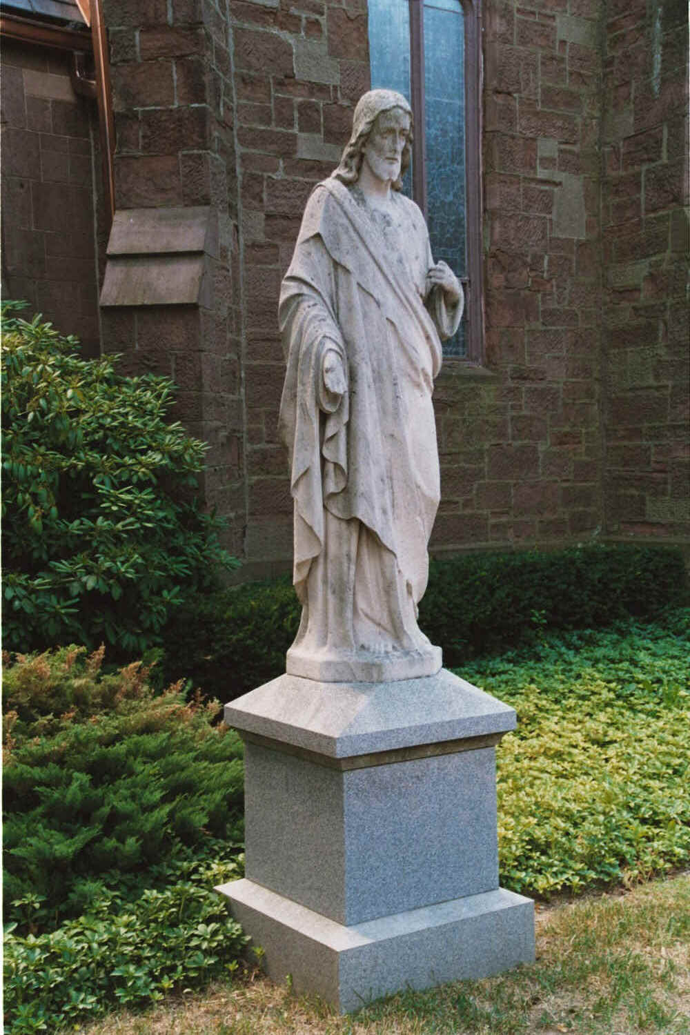 The statue of the Sacred Heart, purchased in 1907 for $230, replaced the statue of the Blessed Virgin on the same granite pedestal in front of the Chapel. Severely weather damaged, it was moved to its present site to the left of the Chapel entrance when the plaza was redesigned in the 1990s.