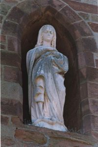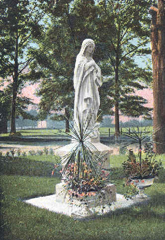 This postcard, of approximately the same vintage (c.1906), shows a statue of the Blessed Virgin on a familiar pedestal. Apparently the statue of the Blessed Virgin was on the pedestal in front of the Chapel for a while before the 1906 renovations. It was then moved to the niche. Are we sure it is the same statue? A photograph of the statue today confirms this supposition.