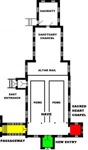 The 1906 renovations closed the old entrance (red), which became the Sacred Heart Chapel, added a new entrance (green), and the passageway (yellow) to the Seminary Building (Presidents Hall).