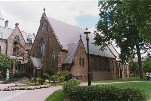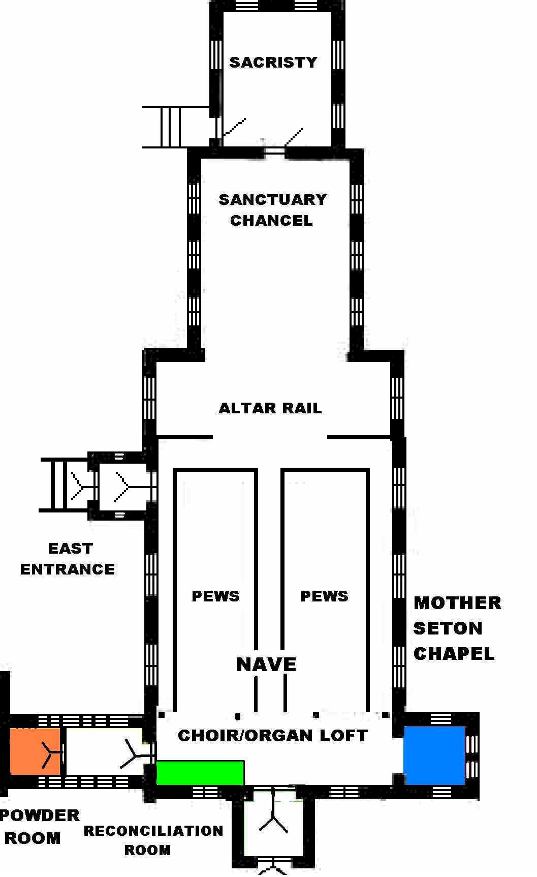 The exterior of the Chapel in 2000 essentially remained the same as it was in 1863. The only changes are the additions of the sacristy, the passageway, and the new entry. These have been in place for almost a century. The Chapel of the Sacred Heart became the Chapel of St. Elizabeth Ann Bayley Seton in 1964. The only internal structural changes were the addition of the “powder room” in the late 1980s, made necessary by the increasing number of weddings in the Chapel, and the enclosing of a space for a “Reconciliation Room” for the celebration of the Sacrament of Reconciliation about the same time. In the 1990s, a ramp for handicap entry was added to the exterior, a new plaza was constructed in front of the Chapel and the statue of the Sacred Heart was moved to the left of the main entrance of the Chapel.