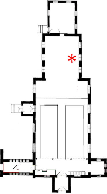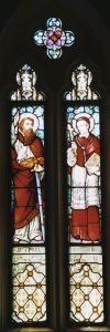 “This set of six windows was donated by Reverend Joseph H. Meehan” is inscribed beneath the scroll naming the saints.
