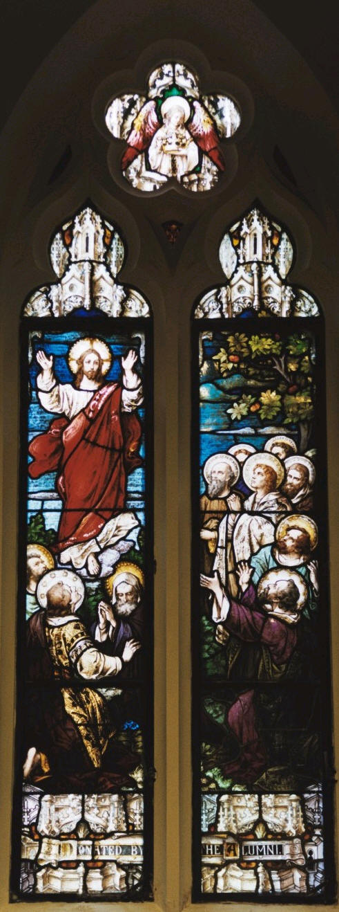 The window of the Ascension of the Lord provides an insight into the mystery that St. Luke depicts twice, as the hinge between his first and second volume (Luke 24:50-53 and Acts 1:6-11). As great High Priest, his wounds reminding us that he is also the Lamb of sacrifice, Jesus blesses the Apostles and the infant Church. The scene is reminiscent of the description of the high priest at the end of the Temple liturgy. “He came down and lifted up his hands over the whole congregation of the children of Israel, he pronounced the blessing of the Lord with his lips…” (Numbers 6:24-26)”…and they bowed down in worship…to receive the blessing from the Most High” (Sirach 50:20-21). In the heavenly Liturgy, Jesus continues to intercede for his Church and mediates the blessing of the heavenly Father through the Holy Spirit.