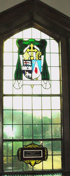 The windows depict the coats of arms of bishops closely associated with Seton Hall: Archbishops Bayley, Walsh, and Boland; and Bishops McQuaid and McLaughlin.