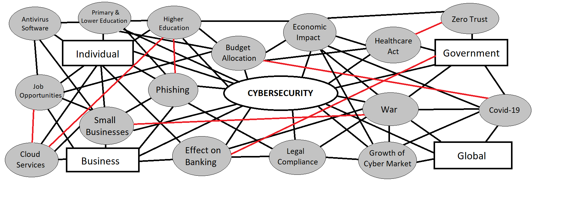 In order to project trends, the fringe sketch is vital. The intent behind this sketch is directed toward understanding the overall concepts that surround cybersecurity and learning about future emerging trends in the field. The fringe sketch is depicted as a web that is meant to connect or “weave” each concept to indicate that each part of cybersecurity works together; the sharp, black lines signal direct or primary connections while the red lines signify secondary connections. With technology being one of the key drivers of society, cybersecurity along with cyber-attacks continue to advance at a tremendous rate and will only continue to grow into the future. The impacts of cybersecurity have a firm hold on every area of the world, regardless of it being on the individual, governmental, business, or global level. Each aspect of cybersecurity is easily connected to another sector, further illustrating the level of complexity of cybersecurity as well as cybercriminals. As our global society becomes more and more digitally engrossed, it is important to look into preventative measures to protect our digital privacy. The environment we live in challenges us to focus on learning the preventative measures needed to secure our data from hackers and the rest of the outside world.