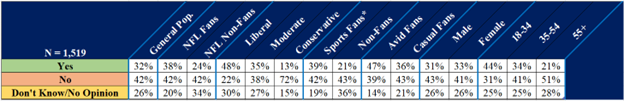 The proposition “I am looking forward to the Bad Bunny Halftime show at the 2026 Apple Music Super Bowl” ignites a passionate response with nearly 1 in 3 Americans (32%) looking forward to the appearance of the 31-year-old three-time Grammy Award-winning star, dubbed the “King of Latin Trap.” The interest rises to a peak among nearly 1 in 2 avid fans (47%) and 4 in 9 young adults (44%, 18-34). The poll results found that the excitement for Bad Bunny crosses gender lines, with men and women at similar levels of support (31% and 33%, respectively).